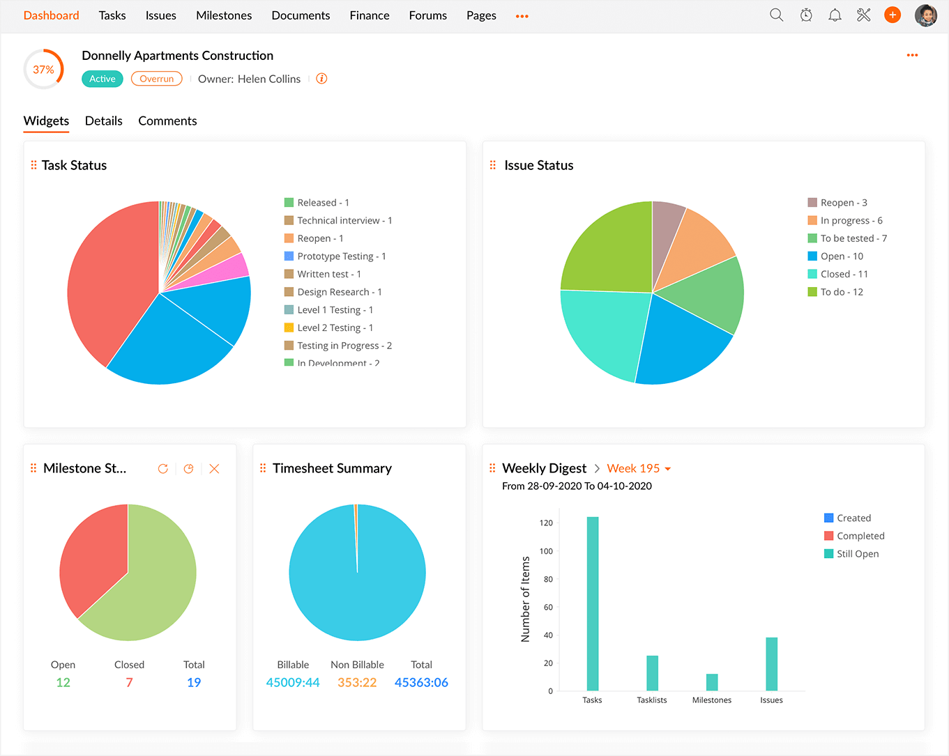 La solution fournit des rapports sous forme de tableaux de bord, pour mieux évaluer le ratio entre le temps prévu, et le temps effectivement passé sur le projet.