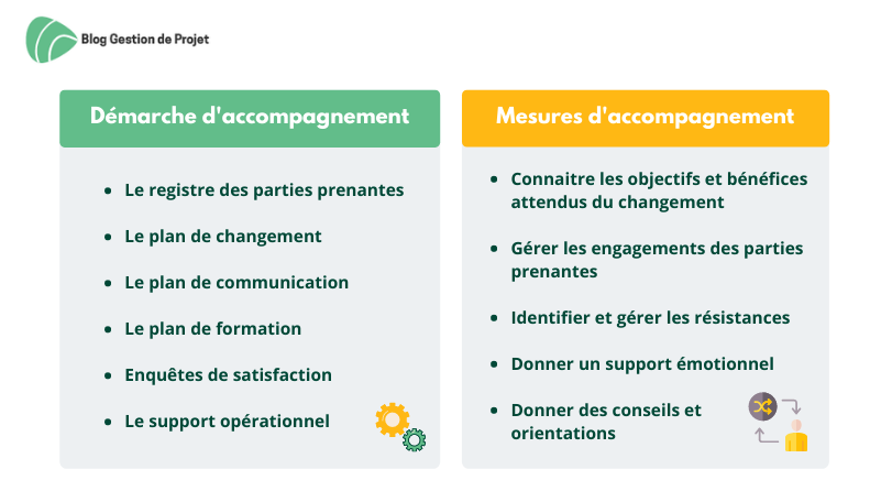 L'accompagnement au changement passe par la gestion et le contrôle des engagements des parties prenantes du projet, et nécessite d'établir un plan de conduite du changement dans le but de réussir l'adoption du changement.